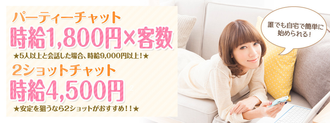 最高の在宅ワークのチャットレディ大募集! ・完全顔出しNGでもOK! ・ハイスペックPC・WEBカメラ無料貸出 ・平均時給3000円以上の高時給 ・24時間LINEでサポート! ・確実に稼げるマニュアル完備 頑張れば頑張るほど高収入を稼げます ☆。・:*:・°★,。・:*:・°☆。・:*:・°★,。・:*:・☆。・:*:・°★,。・:*:・°☆。・:*:・°★,。・:*:・ 【報酬について】 ・2ショットチャット 一人のお客様と二人きりでチャットします。 1分75円~1分120円 1時間4,500円~1時間7,200円 ・パーティーチャット 複数のお客様とチャットをします。 同時に沢山のお客様とチャットをする事が出来るので、 人数が入ればはいる程、短時間で効率よく稼げるのがパーティーチャットの魅力です。 【パーティーチャット実際の例】 ・5人[...もっと読む]
